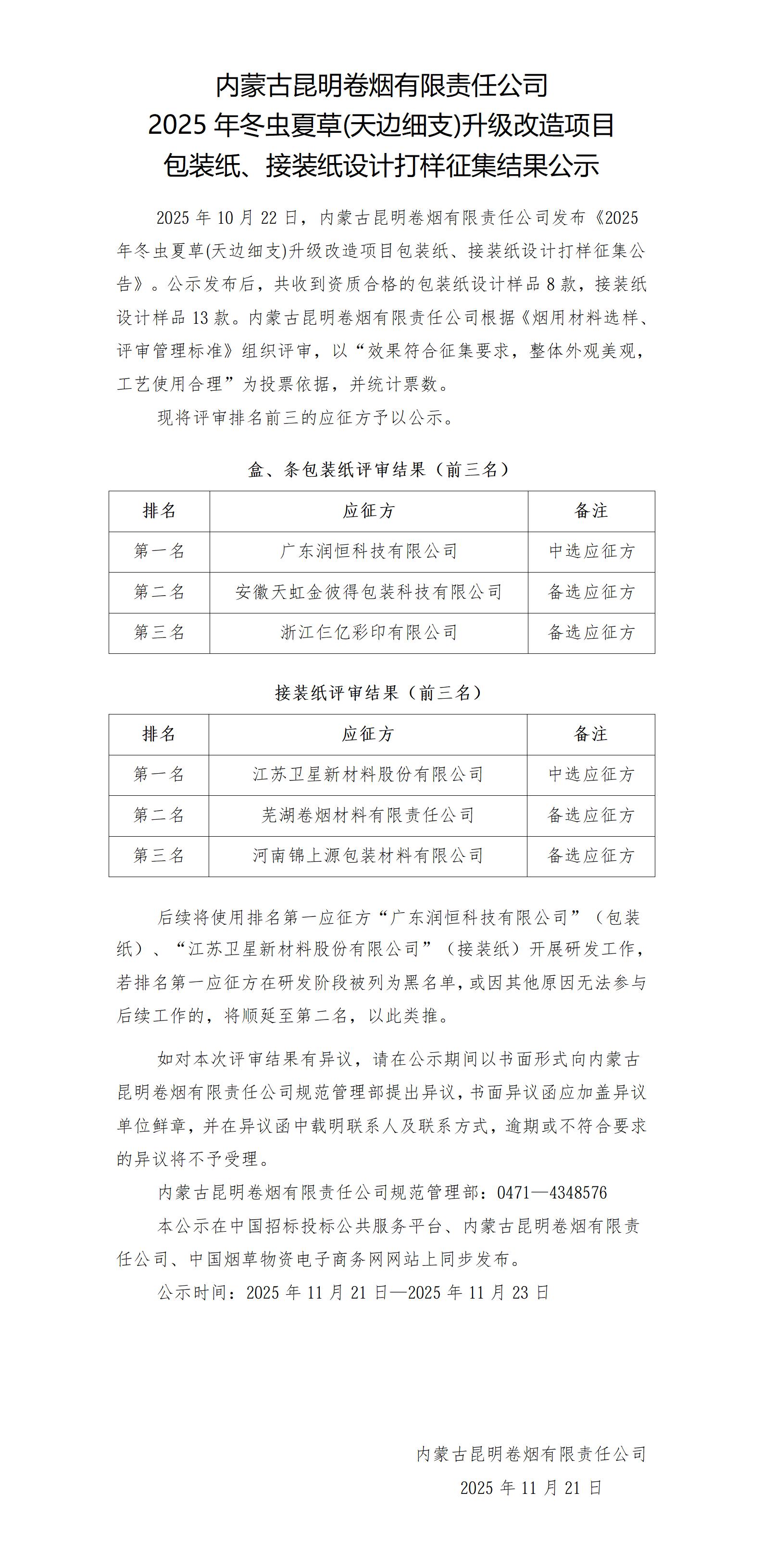 蒙昆公司2025年冬蟲夏草(天邊細(xì)支)升級改造項目包裝紙、接裝紙設(shè)計打樣征集結(jié)果公示
