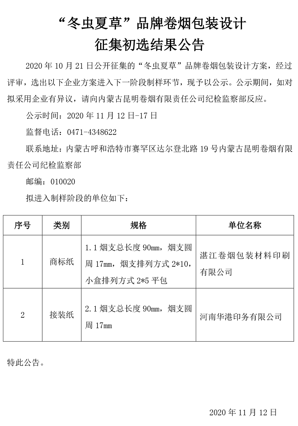 “冬蟲夏草”品牌卷煙包裝設(shè)計(jì)征集初選結(jié)果公告
