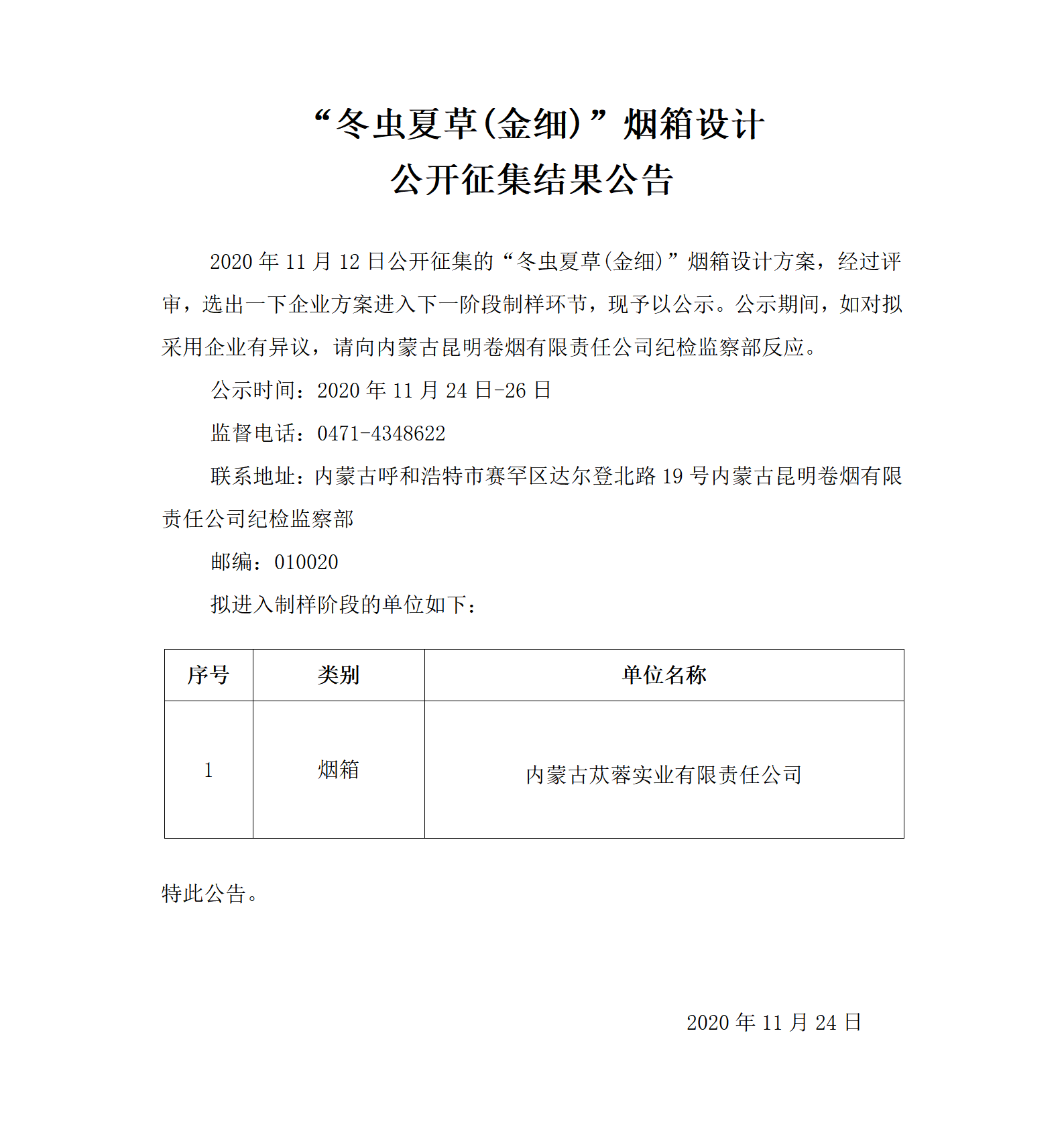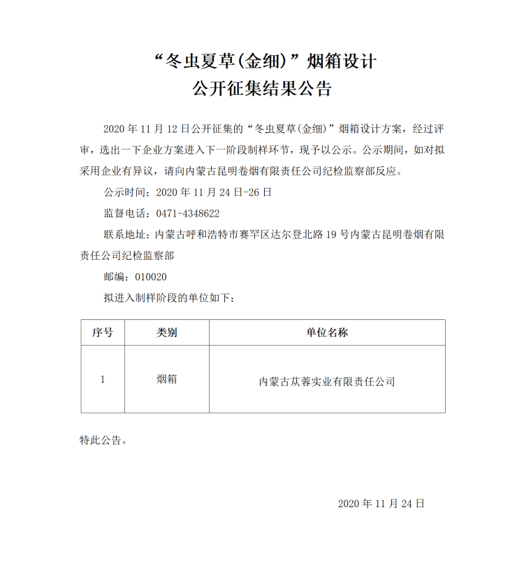 “冬蟲夏草(金細(xì))”煙箱設(shè)計(jì)公開征集結(jié)果公告