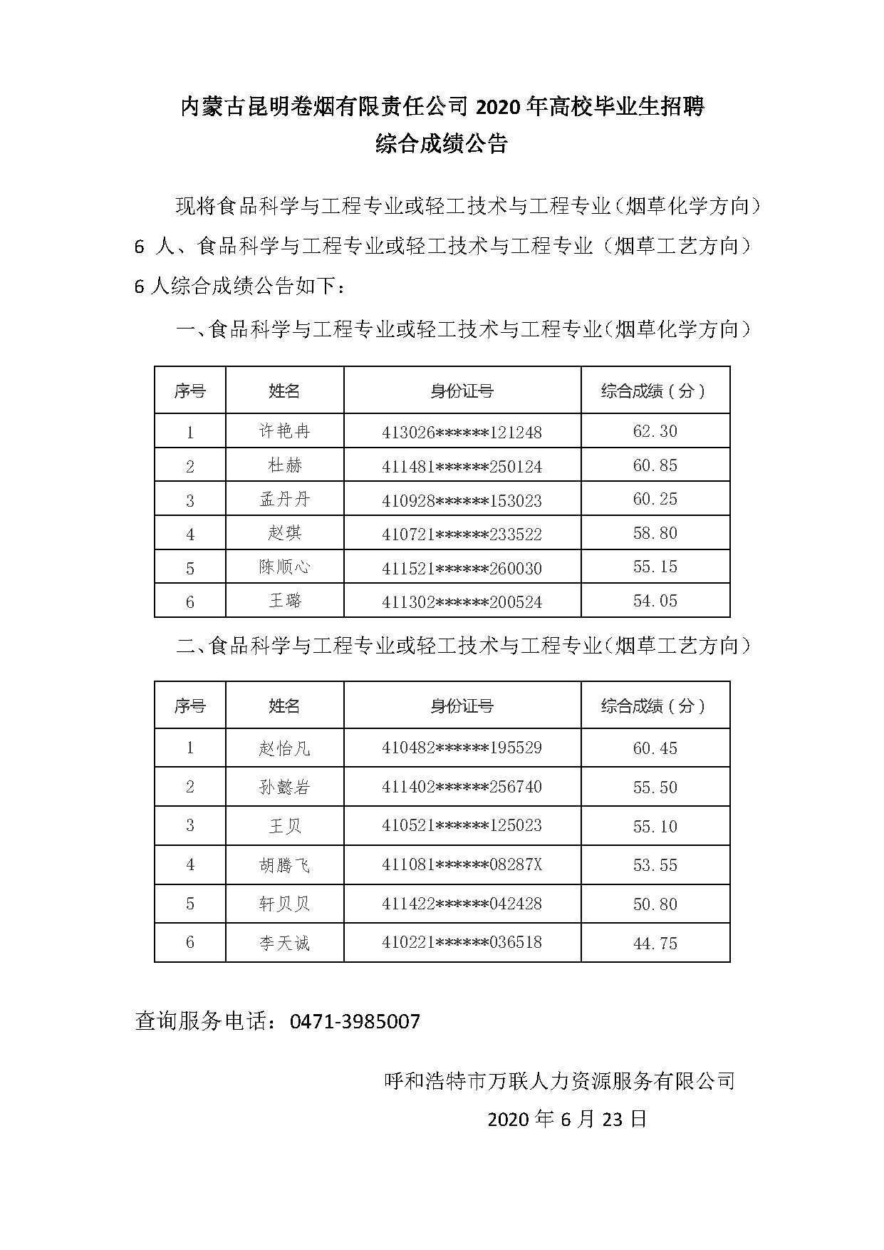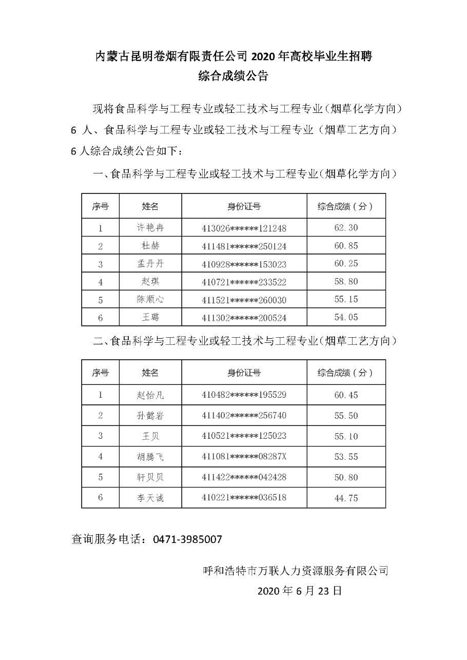 內蒙古昆明卷煙有限責任公司2020年高校畢業(yè)生招聘綜合成績公告