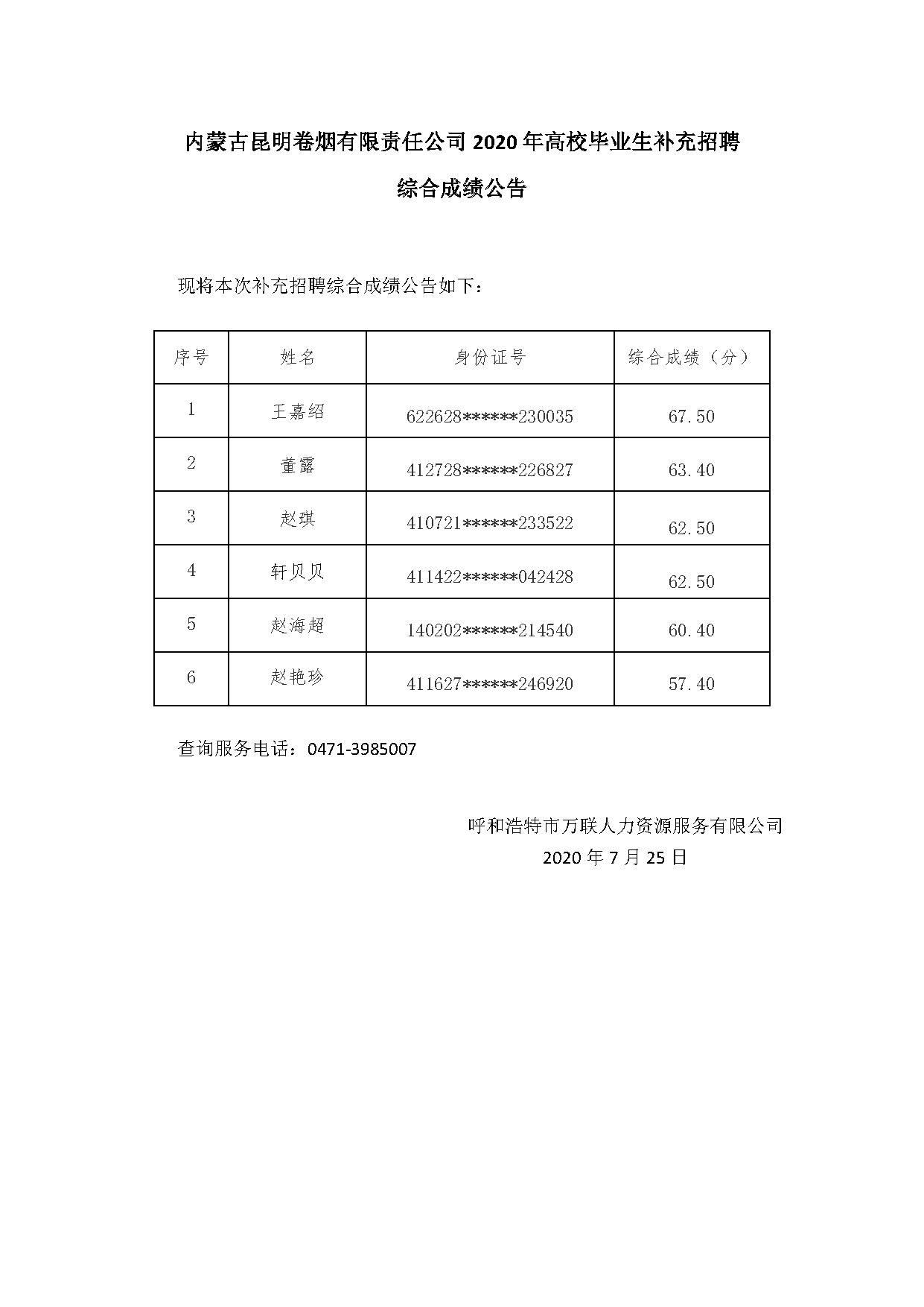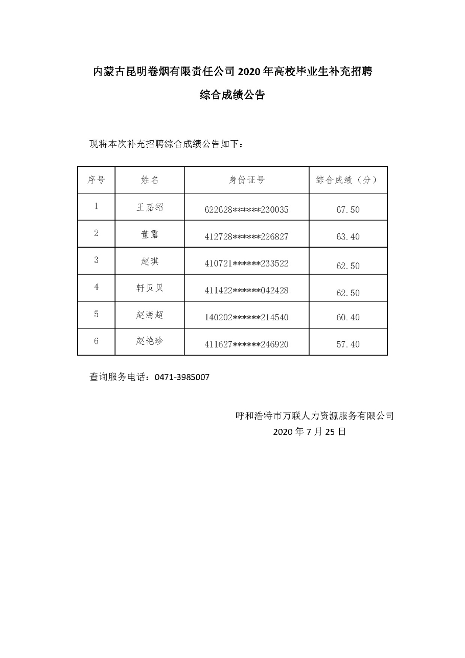 內(nèi)蒙古昆明卷煙有限責(zé)任公司2020年高校畢業(yè)生補充招聘綜合成績公告