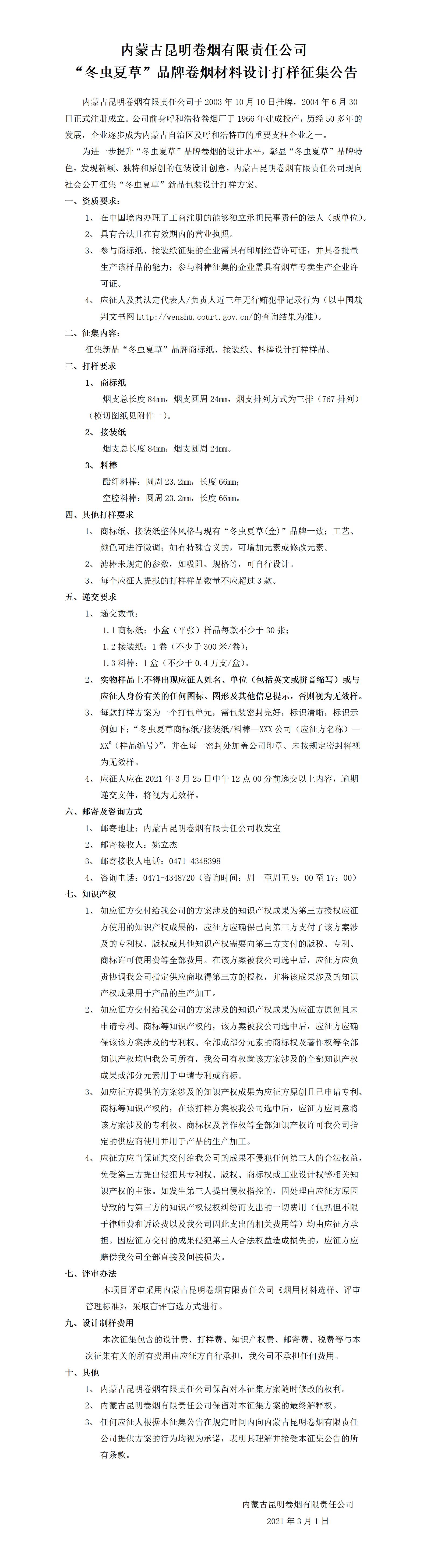內(nèi)蒙古昆明卷煙有限責(zé)任公司“冬蟲夏草”品牌卷煙材料設(shè)計(jì)打樣征集公告