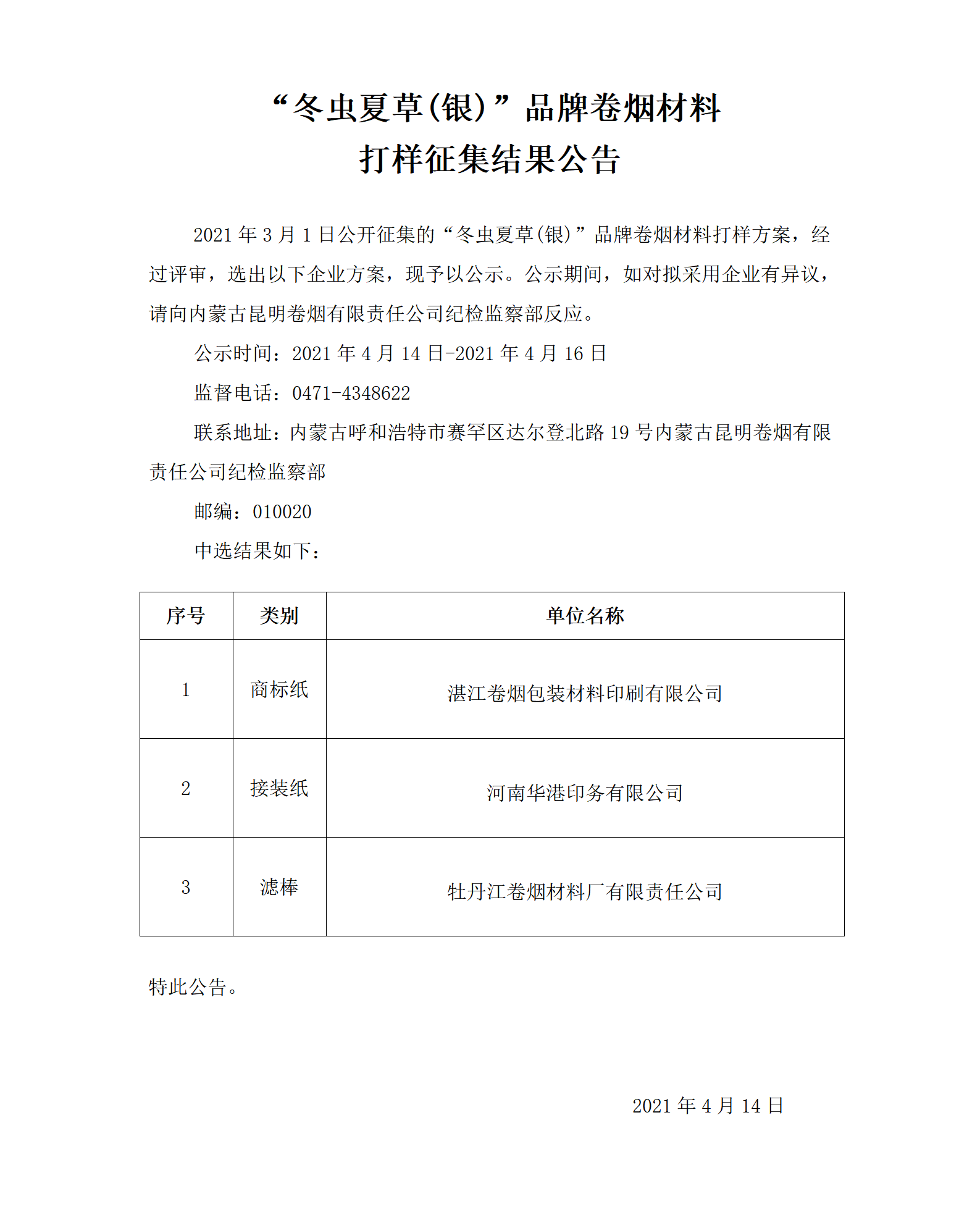 “冬蟲夏草(銀)”品牌卷煙材料設(shè)計打樣征集結(jié)果公告