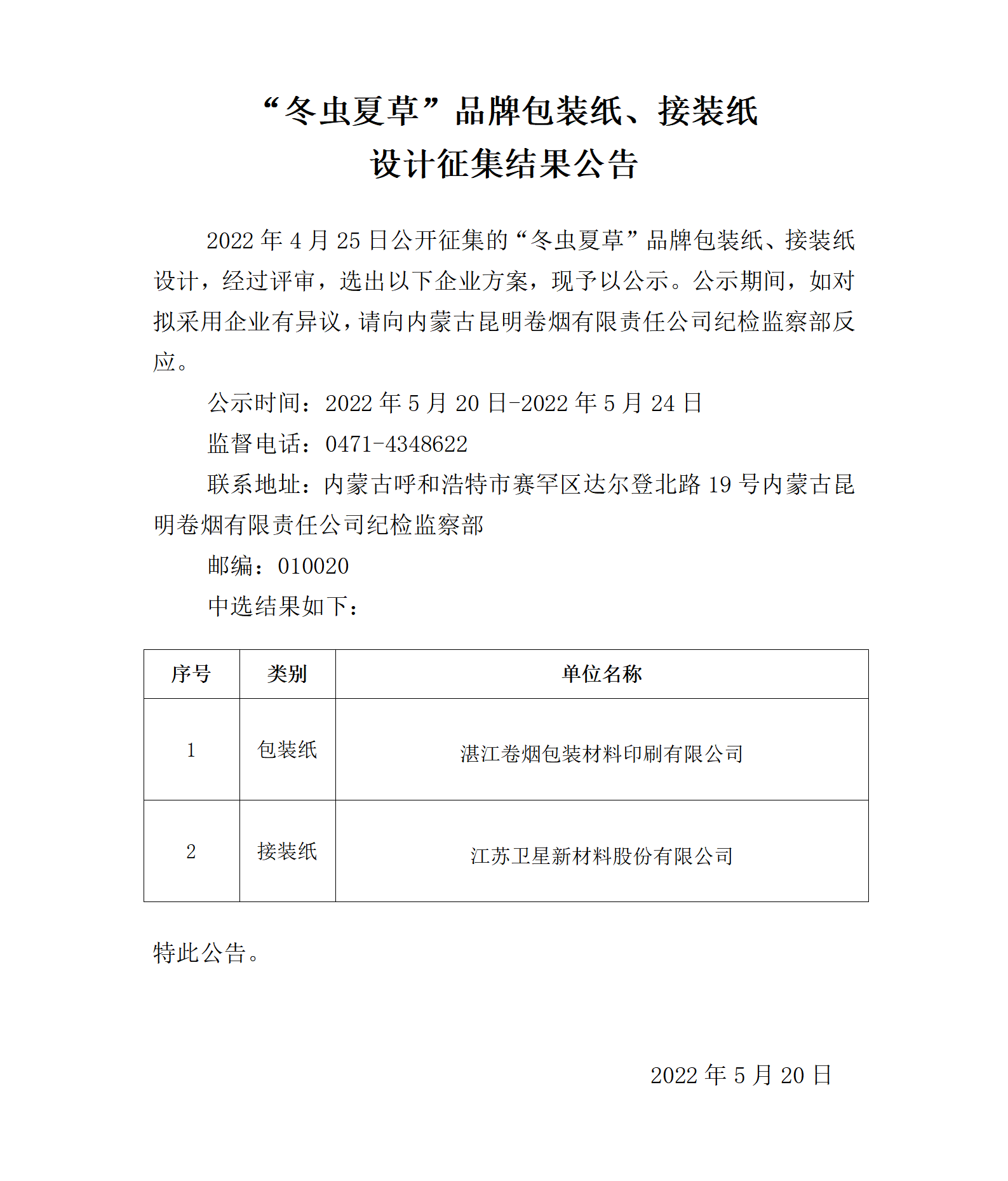 “冬蟲夏草”品牌包裝紙、接裝紙?jiān)O(shè)計(jì)征集結(jié)果公告