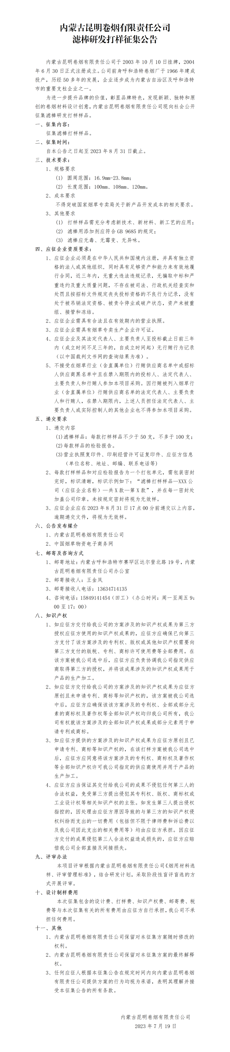內(nèi)蒙古昆明卷煙有限責(zé)任公司濾棒研發(fā)打樣征集公告