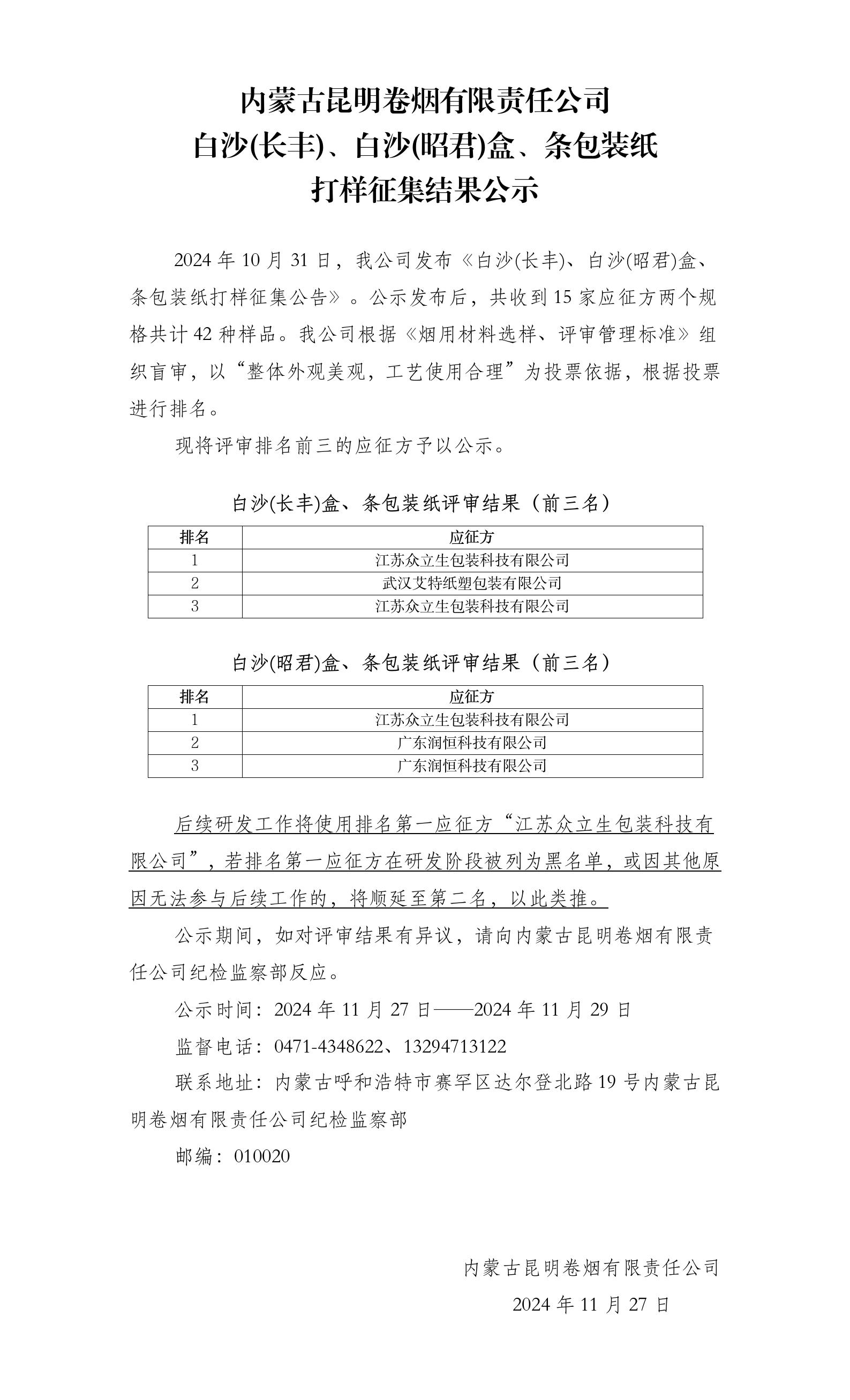 內(nèi)蒙古昆明卷煙有限責(zé)任公司 白沙(長(zhǎng)豐)、白沙(昭君)盒、條包裝紙 打樣征集結(jié)果公示